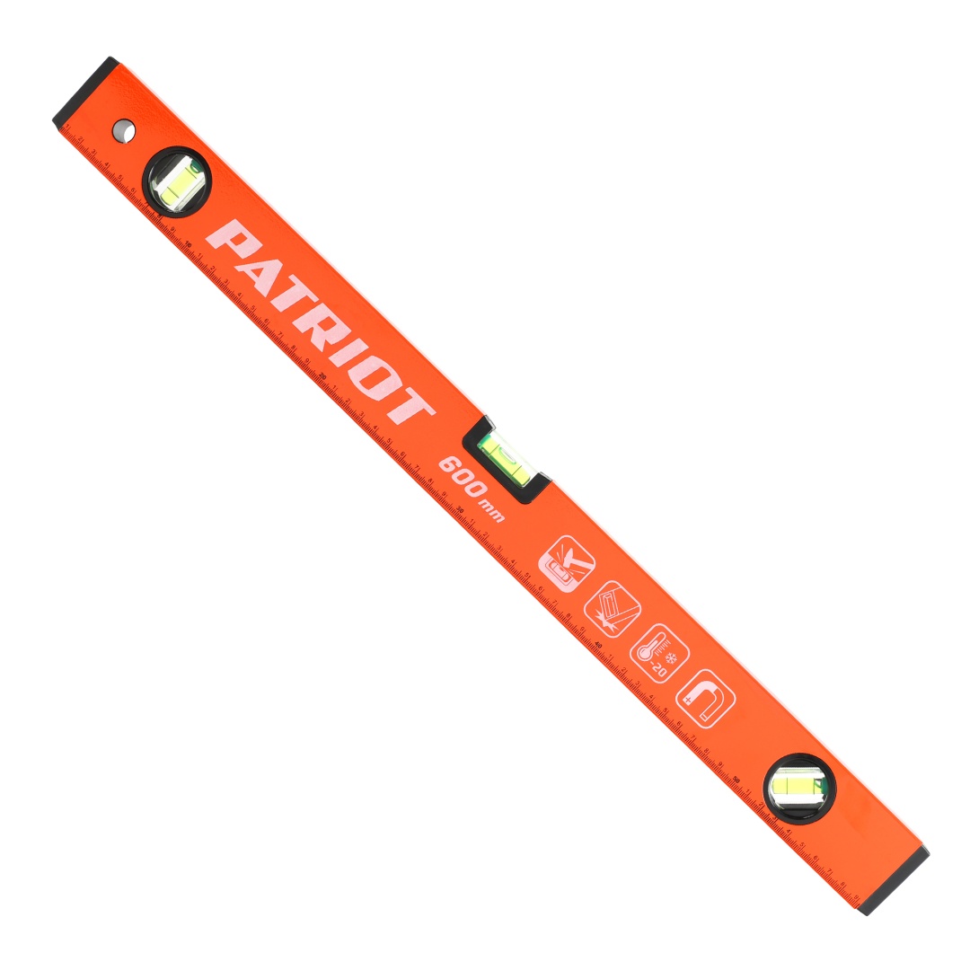Уровень строительный PATRIOT LRP-600 длиной 600 мм для определения отклонения плоскости относительно горизонтали или вертикали с точностью до 0,5 мм/м. Корпус выполнен из алюминиевого сплава, устойчивого к коррозии. Торцы заглушки обеспечивают устойчивость к деформациям при падании.