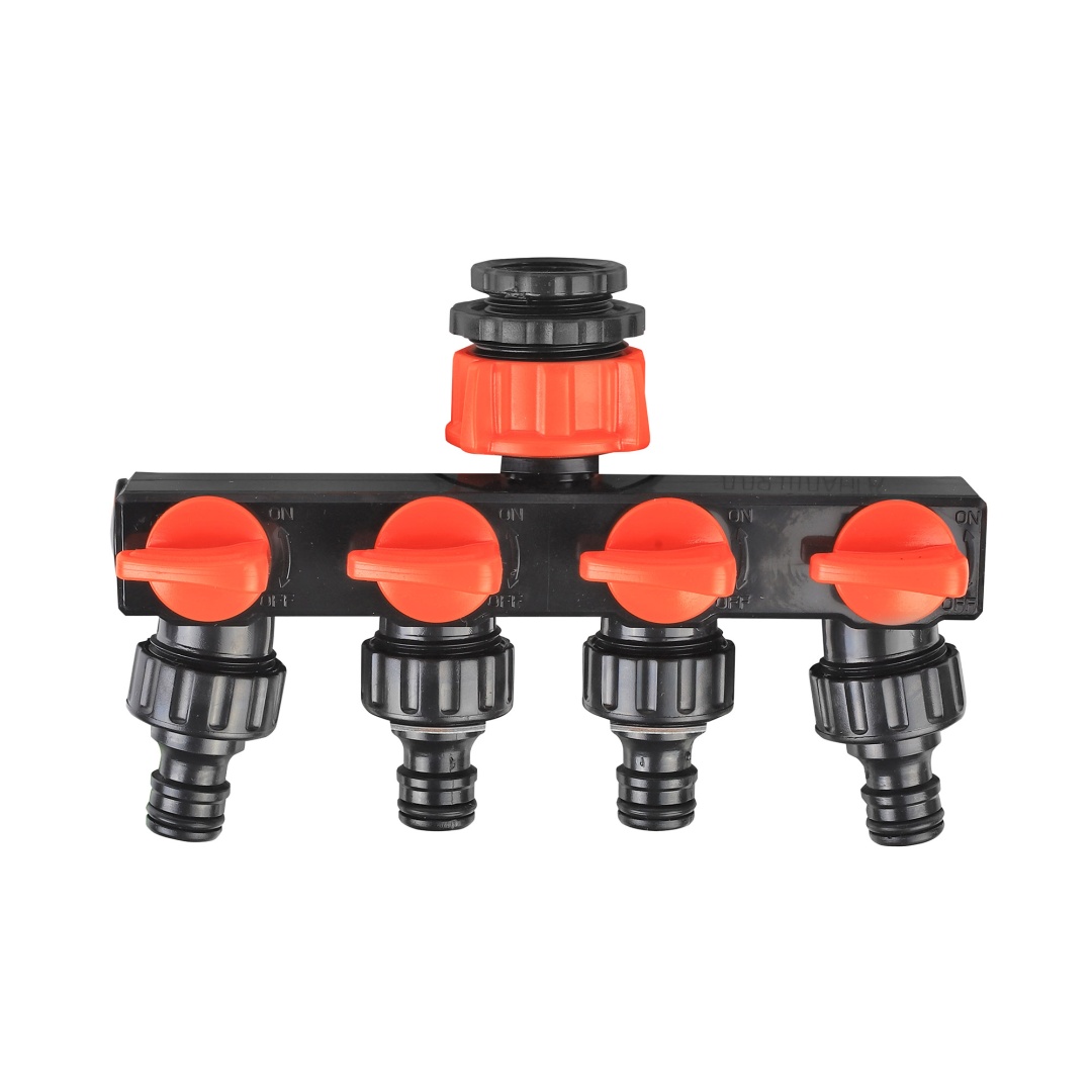 Разветвитель четырёхканальный (1/2"; 3/4"; 1”) является составной частью системы полива и предназначен для разветвления подачи воды в шланге при поливе. Краны предоставляют возможность регулировать напор воды в линиях.